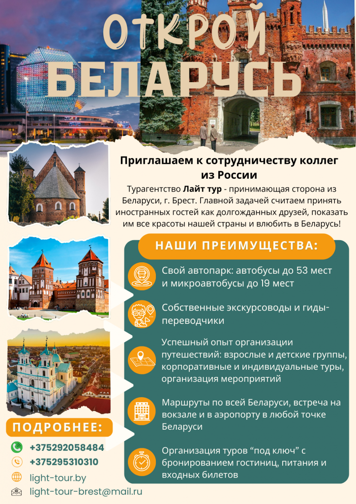 Опираясь на многолетний опыт, наше турагентство может предложить услуги по организации экскурсионных туров для иностранных групп и индивидуальных туристов. Главной задачей мы ставим перед собой встречу гостей, как давних друзей: стремимся показать все самое лучшее и влюбить в Беларусь!